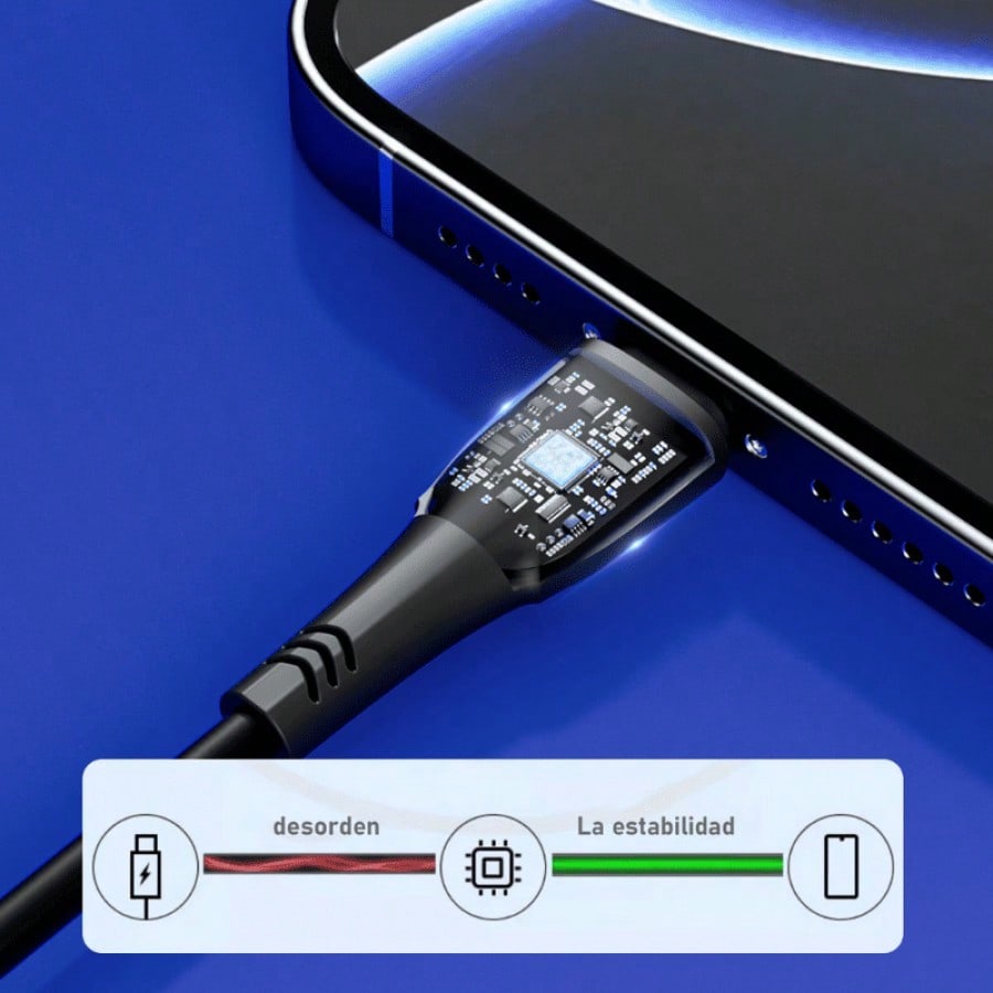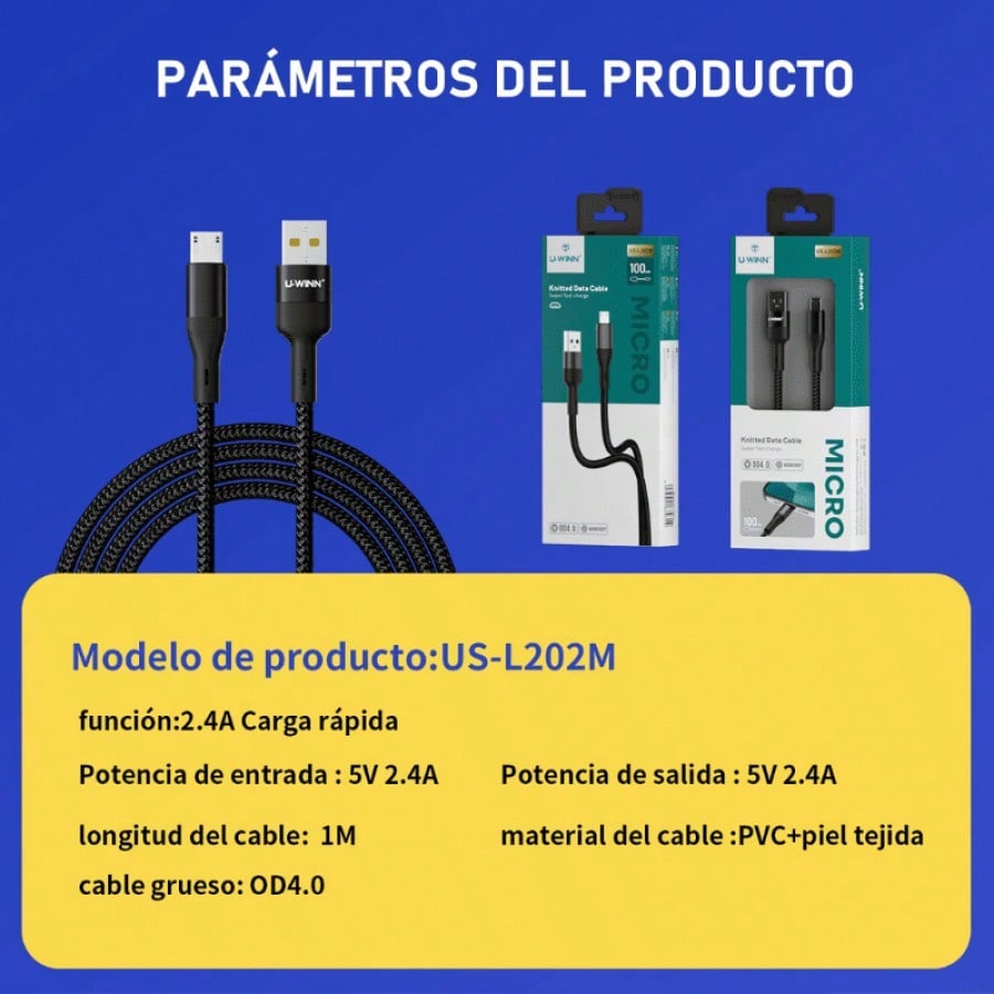Cable Micro USB con capacidad de carga de 2.4A. Sus 4 hilos internos permiten una transferencia de datos de 480 Mbps. Con una longitud de 1 metro, su material de PVC y Nailon Trenzado lo hace resistente al uso constante.