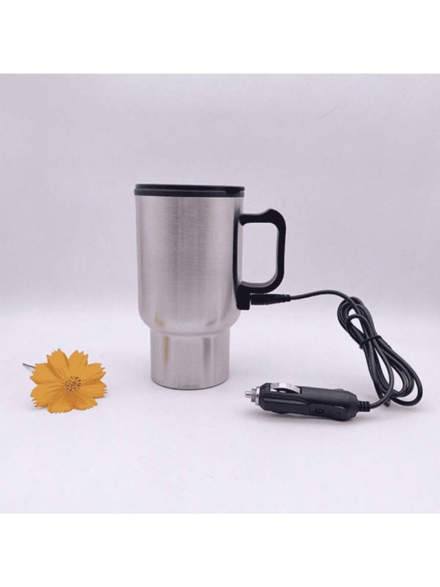Taza calefactora 450ml para coche 12V. Interior plástico y exterior acero. Mantiene bebidas calientes durante trayectos.