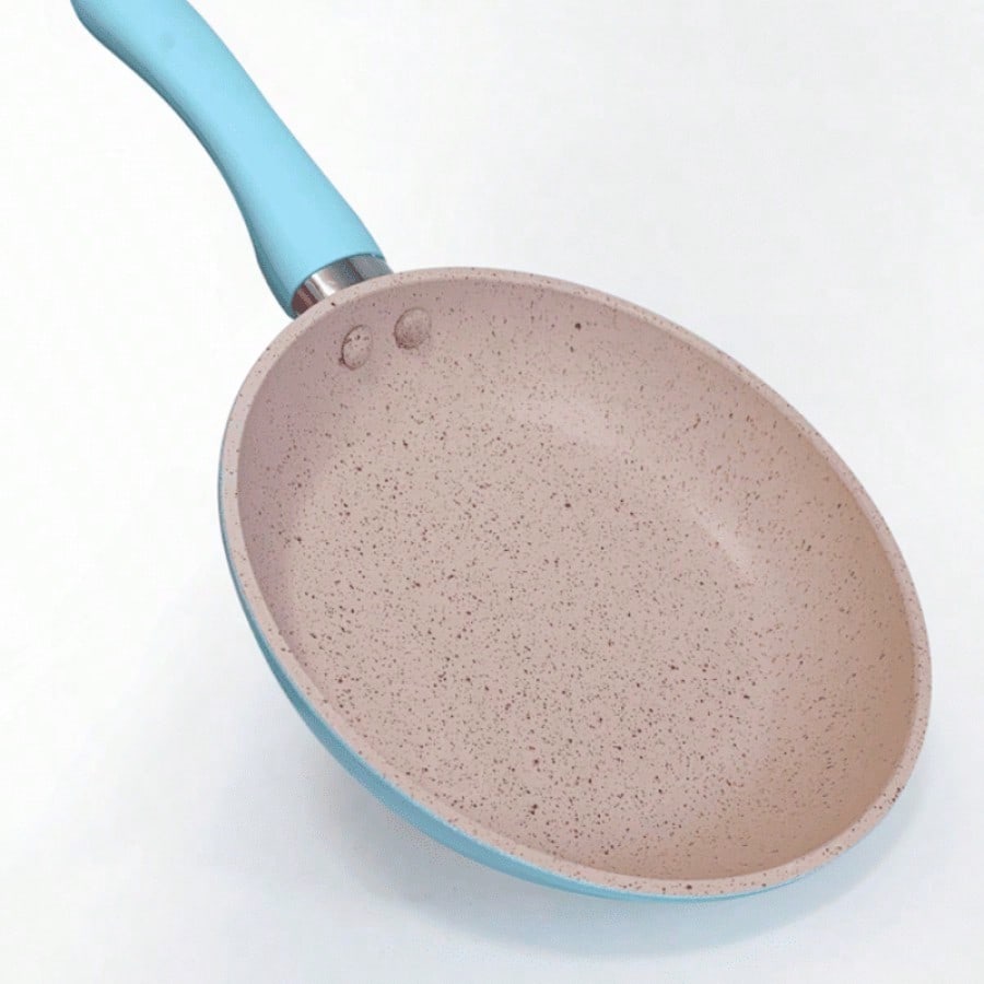 Mini sartén azul claro. Tamaño práctico para preparar porciones individuales o huevos, superficie antiadherente que facilita cocción y limpieza, ideal para desayunos rápidos.