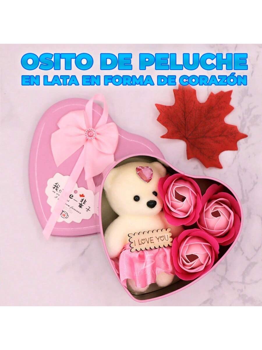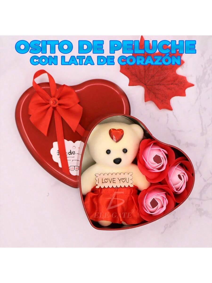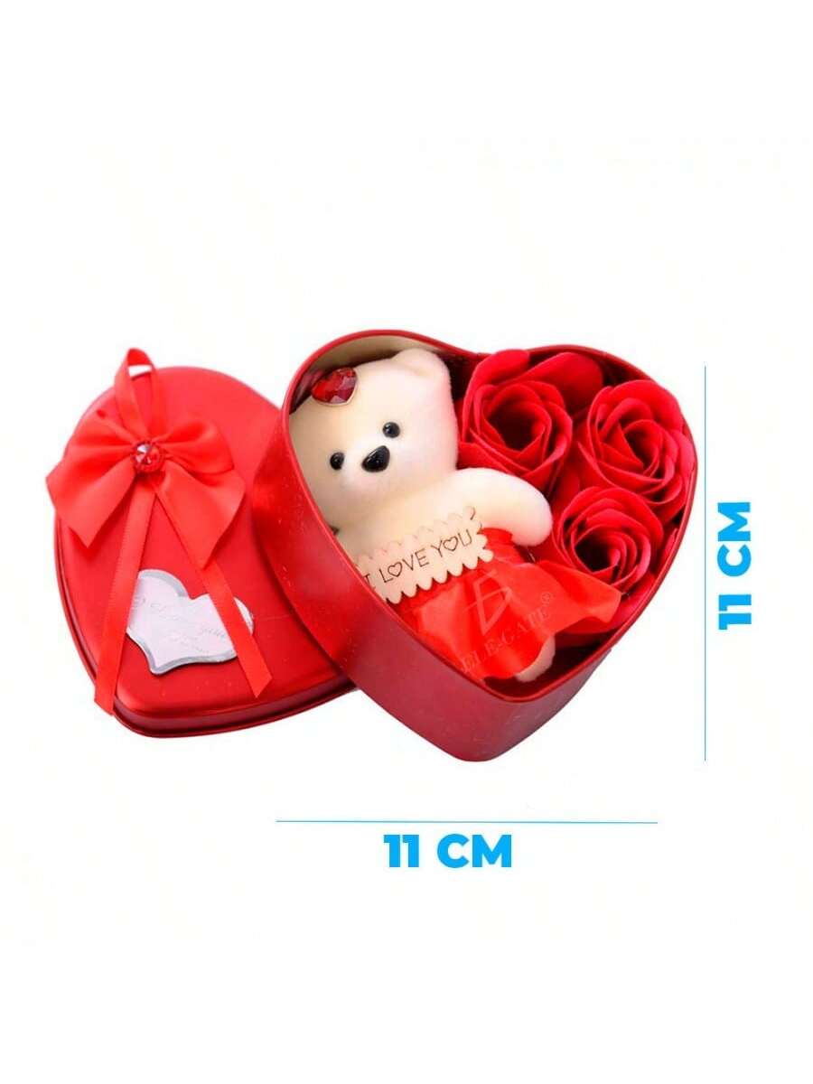 Oso de peluche decorativo de lujo de color rojo y tamaño grande, junto con rosas de jabón y un corazón de plástico, rega