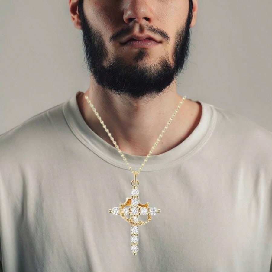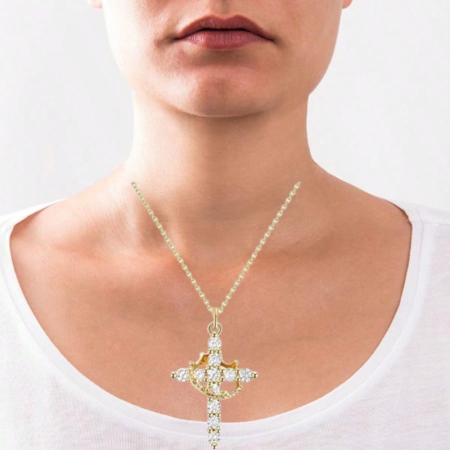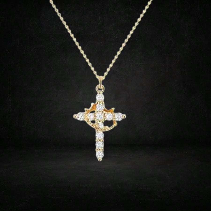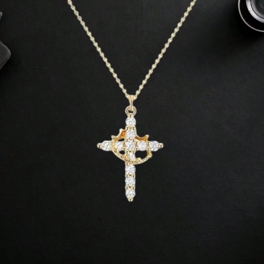 Irradia luz y sofisticación con este deslumbrante collar con colgante de cruz, chapado en oro de alta calidad. Esta joya destaca por su acabado dorado de lujo, que brilla con elegancia con cada movimiento. Su diseño contemporáneo y artístico, con un detalle curvo que abraza la cruz, lo convierte en una pieza única de joyería fina. La cadena se ajusta comodamente y mantiene su belleza a lo largo del tiempo. Es el regalo perfecto para celebrar momentos importantes, combinando un toque de lujo con un símbolo de fe y protección.