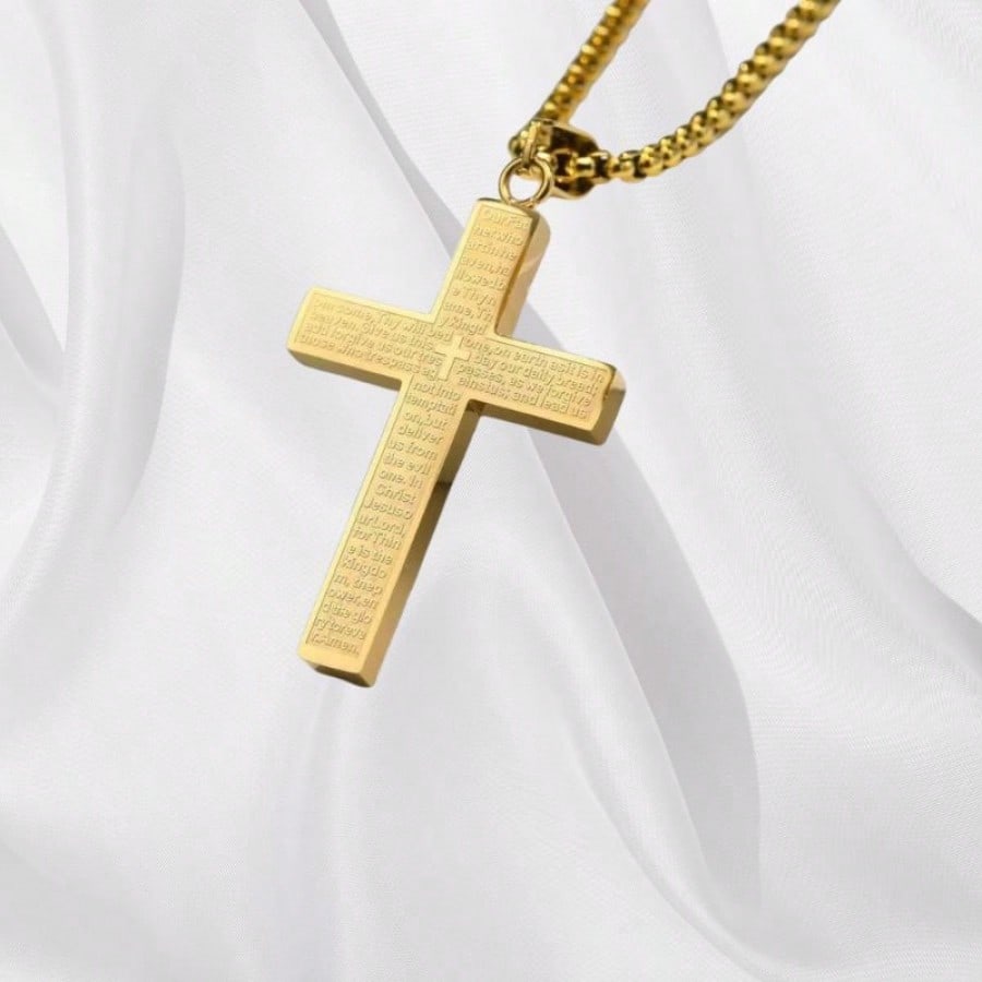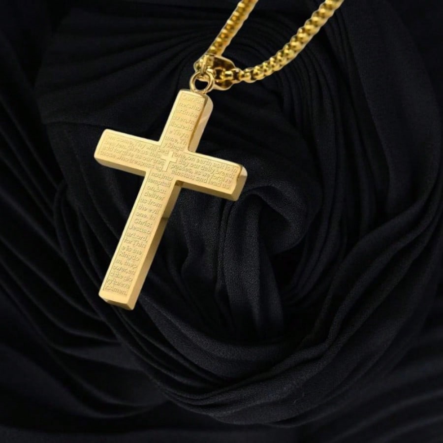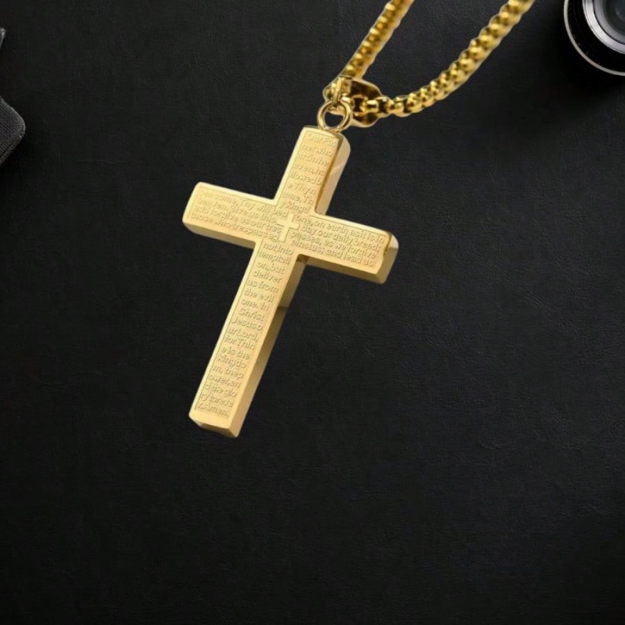 Lleva contigo un símbolo de fe inquebrantable con este magnífico collar con colgante de cruz chapado en oro. Esta pieza única se distingue por llevar grabado meticulosamente el texto de la oración del Padre Nuestro en su superficie, convirtiéndola en un amuleto de protección y espiritualidad. Su acabado pulido y brillante resalta la calidad del acabado, asegurando que luzca impecable en todo momento. El diseño es robusto y moderno, ideal tanto para hombres como para mujeres que desean expresar sus creencias con elegancia. Es el regalo perfecto para ocasiones religiosas o para demostrar afecto a un ser querido con un detalle lleno de significado eterno.
