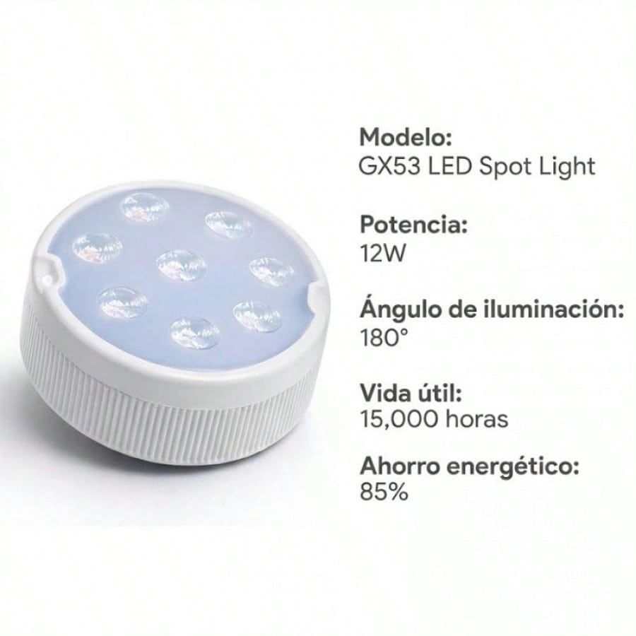 Maximiza la eficiencia y el estilo de tu iluminacion con este paquete economico de 5 focos LED GX53 de 12W. Diseñados para ofrecer un alto rendimiento en un formato compacto, estos focos son ideales para proyectos de iluminacion en cocinas, oficinas o comercios. Su tecnologia LED garantiza un encendido instantaneo y una cobertura amplia gracias a su angulo de 180 grados. Al adquirir este kit, aseguras una iluminacion homogenea en multiples puntos, beneficiandote de un bajo consumo electrico y una larga durabilidad de hasta 15,000 horas por pieza.