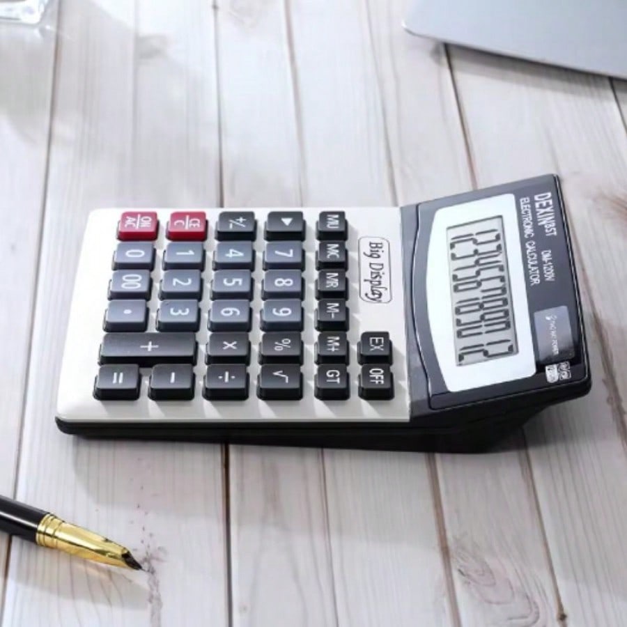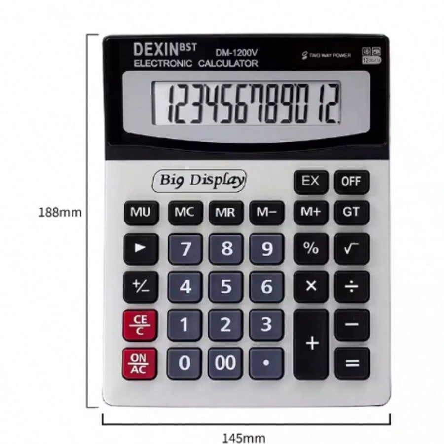 Maximiza tu productividad con esta calculadora electronica de escritorio diseñada para uso intensivo en oficinas y negocios.[1] Cuenta con una pantalla LCD extra grande de 12 digitos que facilita la lectura clara de los numeros.[1] Su construccion destaca por una cubierta metalica duradera que le otorga resistencia y una apariencia elegante y profesional. Funciona con un sistema de energia dual (solar y bateria), asegurando un rendimiento confiable en cualquier condicion de iluminacion.[1] Incluye funciones esenciales como Gran Total (GT), calculo de margen de ganancia (MU), porcentaje y memoria, todo accesible a traves de teclas plasticas grandes y comodas para una escritura rapida y sin errores.
