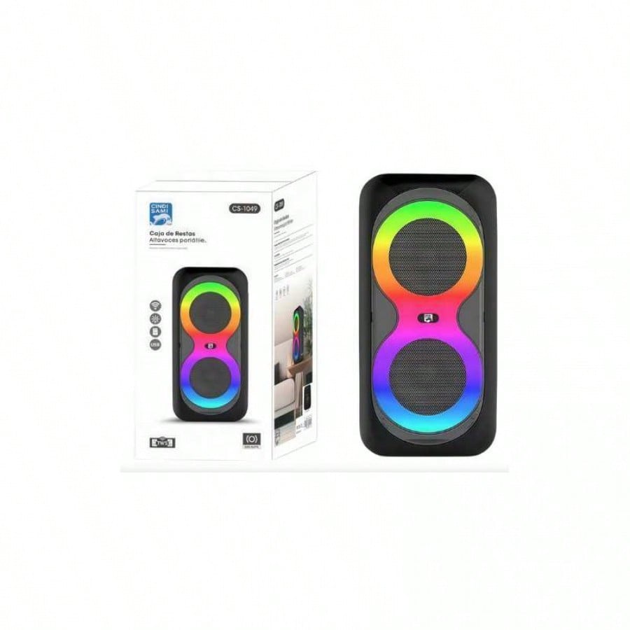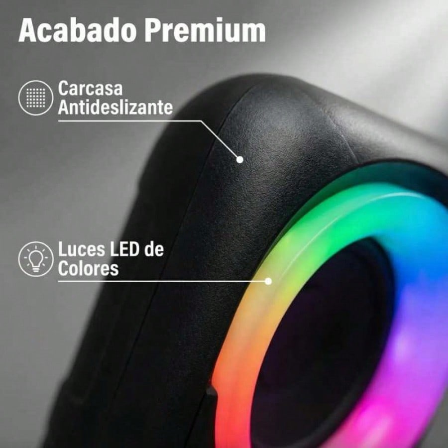 Anima tus fiestas y reuniones con este potente altavoz portatil de 8W que ofrece un sonido nitido y envolvente. Su caracteristica mas llamativa es el sistema de iluminacion LED RGB que rodea los dos altavoces de 4 pulgadas, creando un espectaculo de luces dinamico que se sincroniza con la musica. Ademas de la conexion inalambrica Bluetooth, cuenta con multiples opciones de reproduccion, incluyendo puerto USB, radio FM y una entrada para microfono, convirtiendolo en un equipo de karaoke compacto y versatil. Su bateria recargable de 1500mAh te garantiza horas de musica sin interrupciones. Es el dispositivo ideal para llevar a la playa, dias de campo o simplemente para disfrutar de un ambiente festivo en casa.
