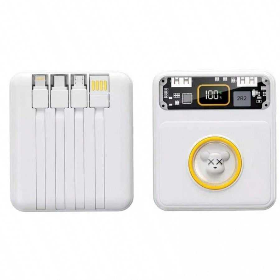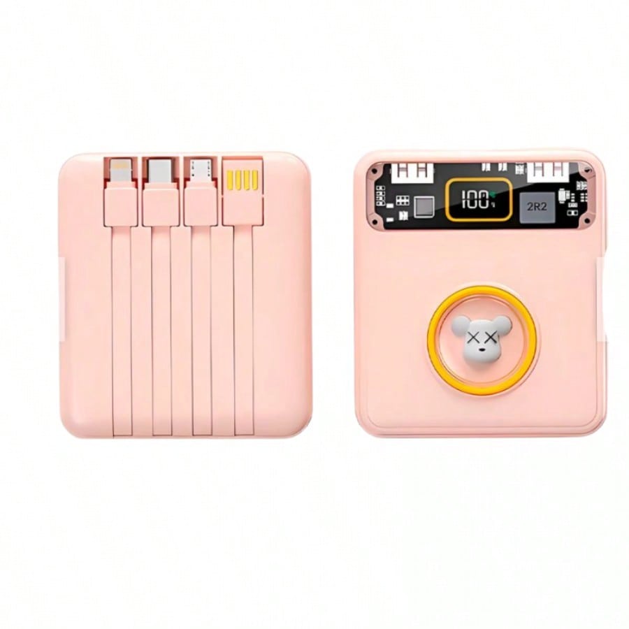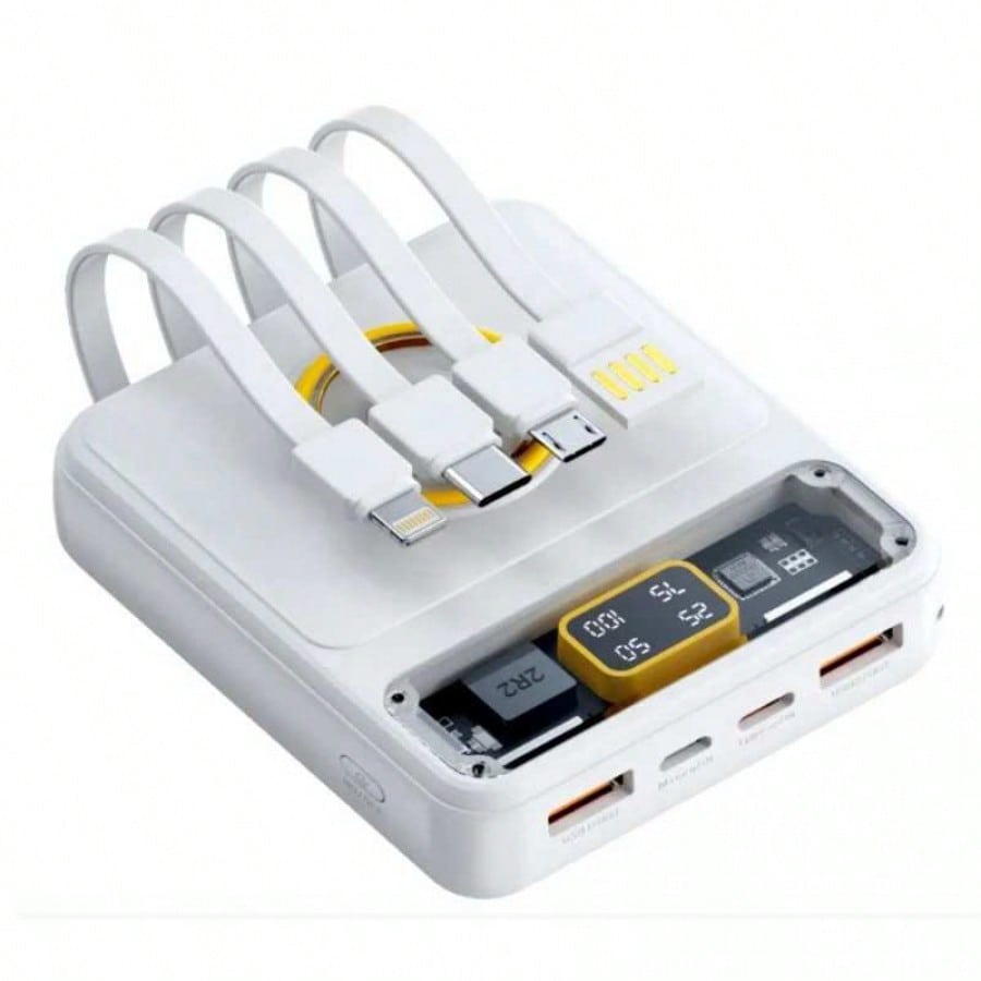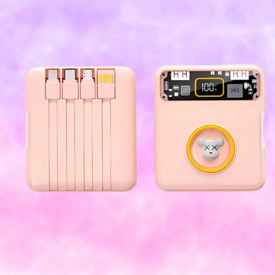 Mantente siempre conectado y con estilo con esta bateria externa de 10000mAh de alta capacidad. Su diseño unico combina colores pastel con una ventana transparente tecnologica y una pantalla LED digital que indica el nivel exacto de energia restante. Lo mas practico es su sistema de cables integrados, que te permite cargar multiples dispositivos sin necesidad de cargar accesorios adicionales en tu bolso. Con soporte para carga rapida de hasta 22.5W y multiples puertos de entrada y salida, es capaz de recargar tus equipos en tiempo record. Es la solucion definitiva para viajeros y usuarios intensivos que buscan eficiencia, rapidez y portabilidad en un solo dispositivo compacto y elegante.