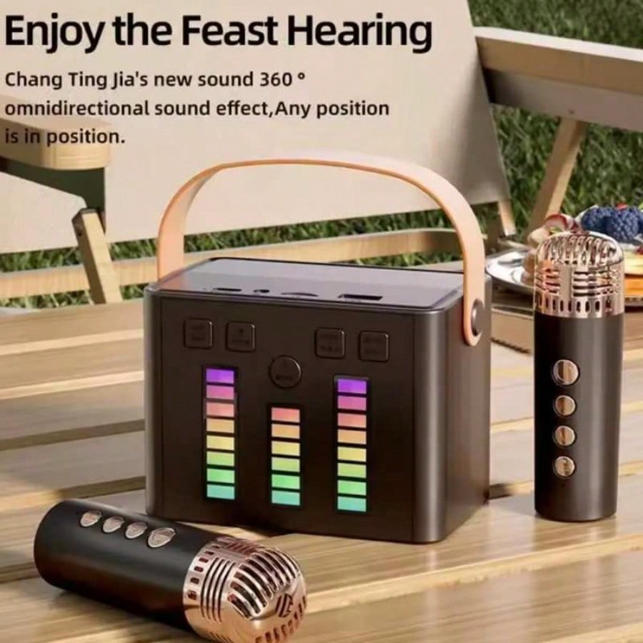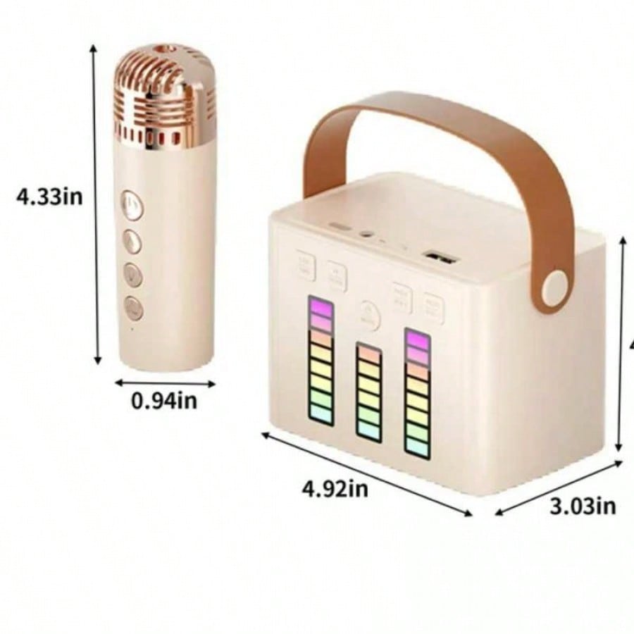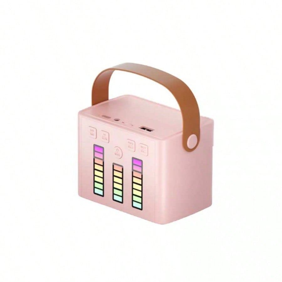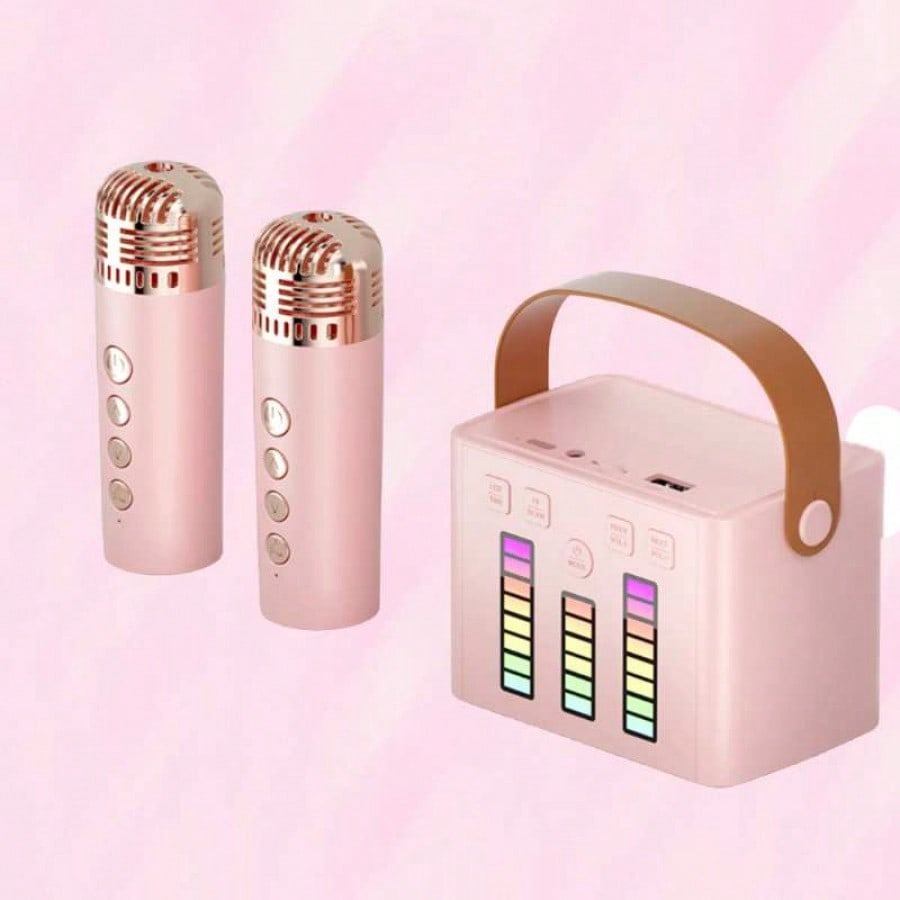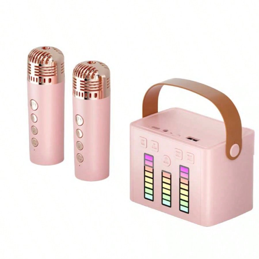 Convierte cualquier reunion en una fiesta inolvidable con este sistema de karaoke portatil todo en uno. Este set incluye un potente altavoz Bluetooth de 5W y dos microfonos inalambricos, permitiendote cantar a duo con tus amigos o familiares sin enredos de cables. Su diseño compacto y elegante incorpora una practica asa de transporte y un espectaculo de luces LED RGB en el panel frontal que simulan un ecualizador y se mueven al ritmo de la musica. Con una bateria recargable de 1200mAh, ofrece entre 3 y 4 horas de diversion continua con una carga rapida. Es compatible con tarjetas TF y memorias USB, siendo el regalo perfecto para niños y adultos que aman cantar y divertirse en cualquier lugar.
