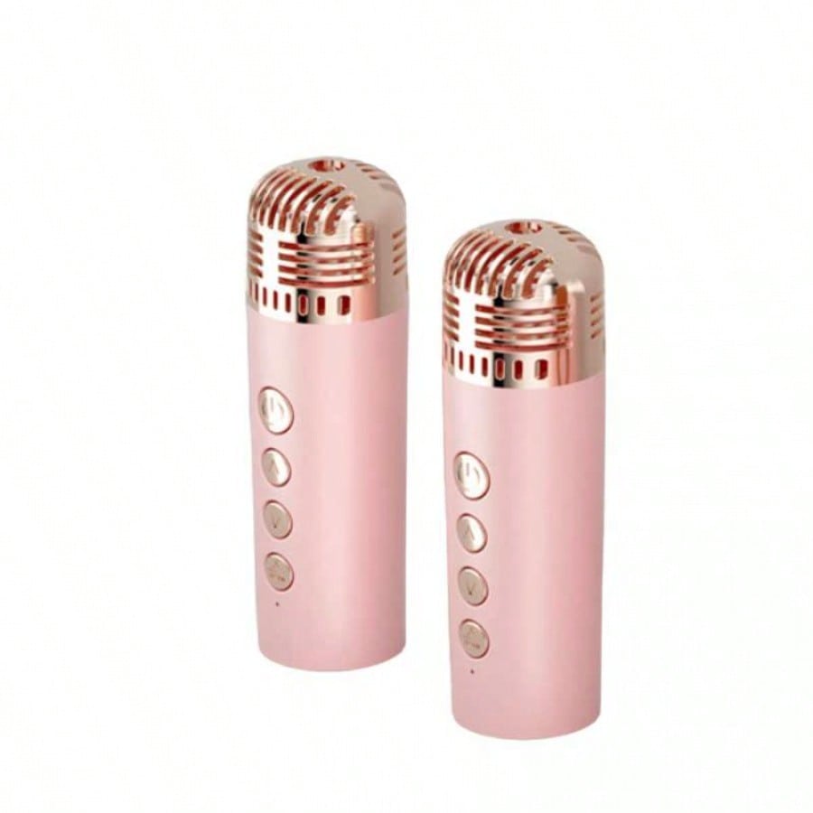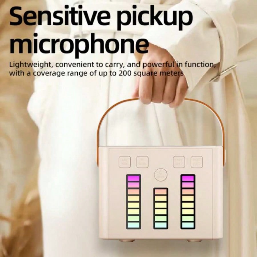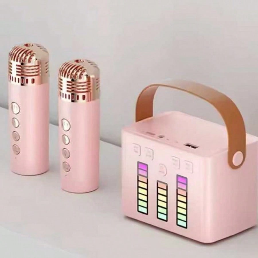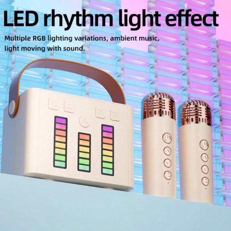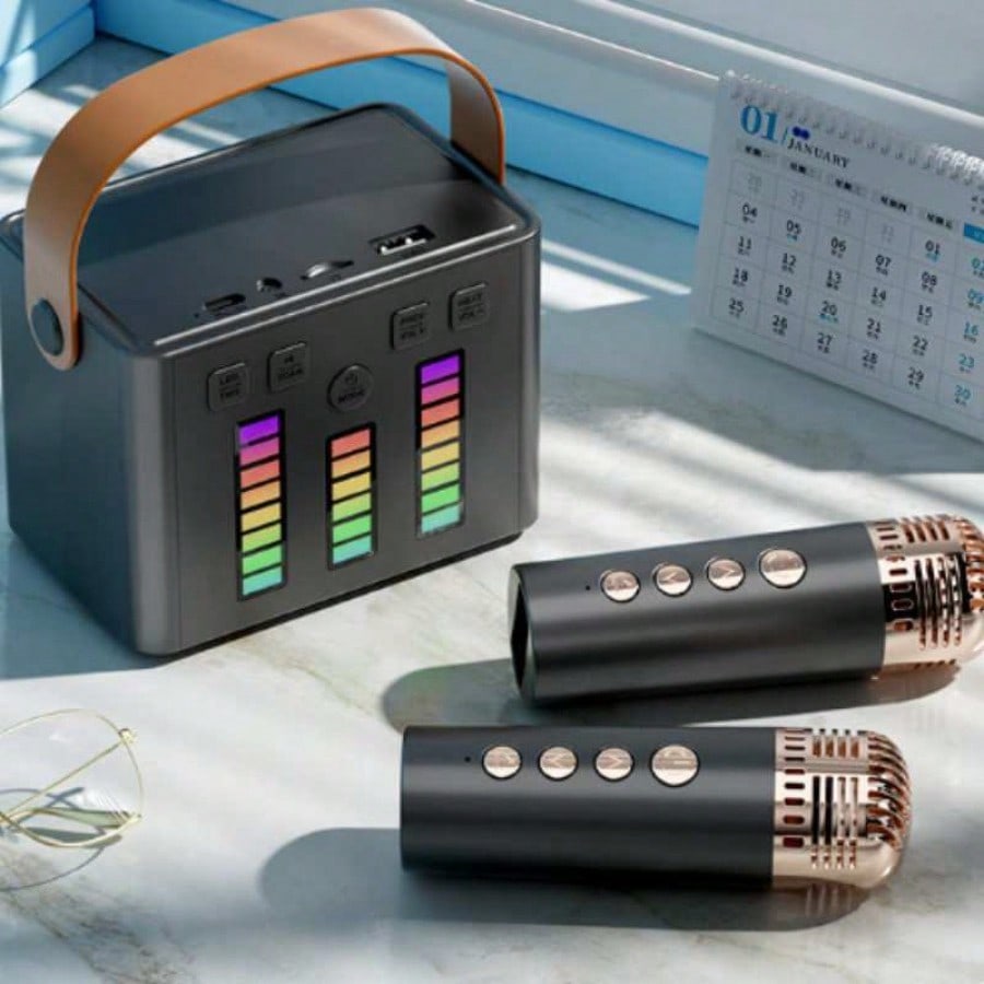 Convierte cualquier reunion en una fiesta inolvidable con este sistema de karaoke portatil todo en uno. Este set incluye un potente altavoz Bluetooth de 5W y dos microfonos inalambricos, permitiendote cantar a duo con tus amigos o familiares sin enredos de cables. Su diseño compacto y elegante incorpora una practica asa de transporte y un espectaculo de luces LED RGB en el panel frontal que simulan un ecualizador y se mueven al ritmo de la musica. Con una bateria recargable de 1200mAh, ofrece entre 3 y 4 horas de diversion continua con una carga rapida. Es compatible con tarjetas TF y memorias USB, siendo el regalo perfecto para niños y adultos que aman cantar y divertirse en cualquier lugar.