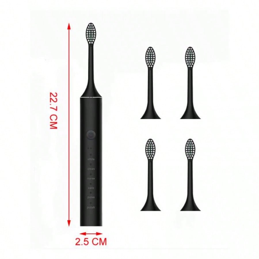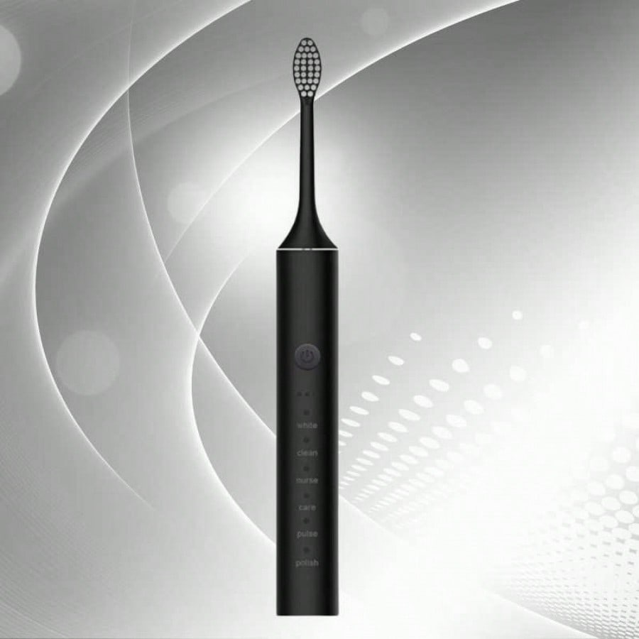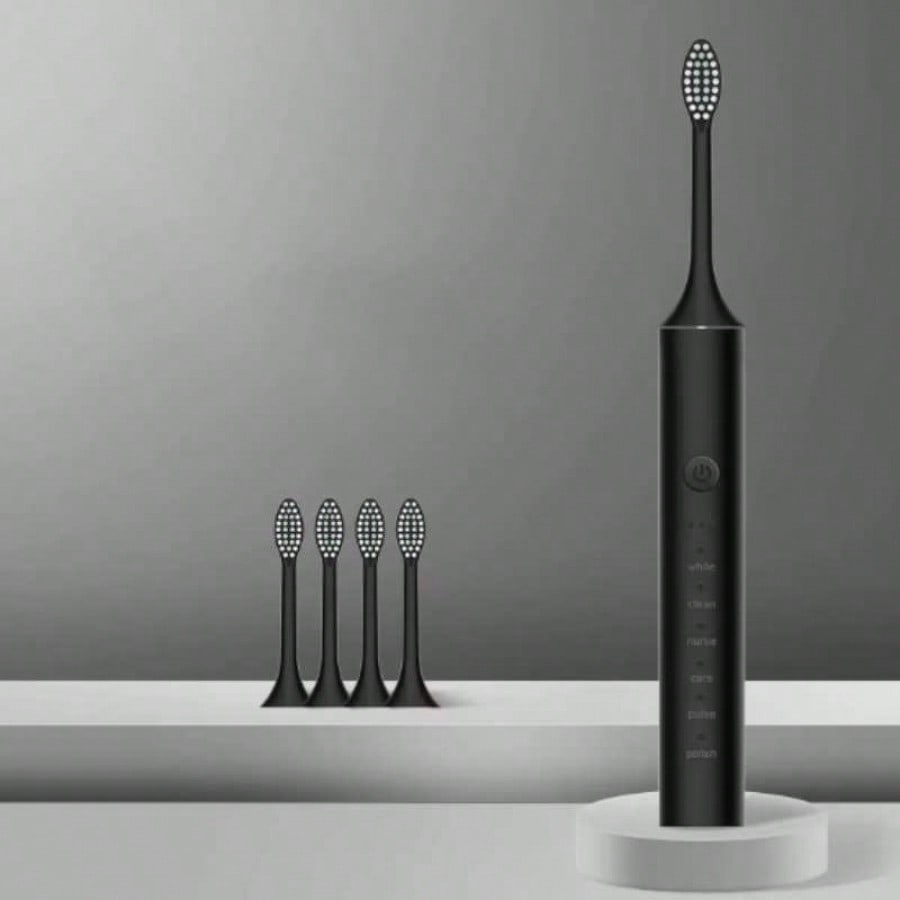 Mejora tu salud dental con este sofisticado cepillo de dientes electrico en acabado negro mate. Su tecnologia de vibracion sonica de alta frecuencia proporciona una limpieza superior, alcanzando los espacios interdentales y eliminando la placa de manera mas efectiva que el cepillado manual. Este set viene completo con 4 cabezales de repuesto de cerdas suaves y duraderas, lo que te garantiza meses de uso continuo. Cuenta con 5 modos de cepillado inteligentes que se adaptan a tus necesidades especificas: limpieza diaria, blanqueamiento, cuidado de encias, pulido y modo suave. Su diseño es ergonomico, impermeable y recargable, lo que lo hace practico y facil de usar tanto en casa como en tus viajes, asegurando una sonrisa brillante y saludable.