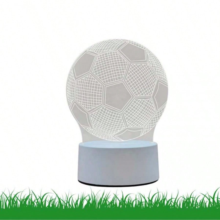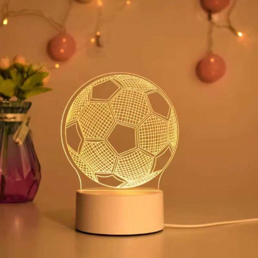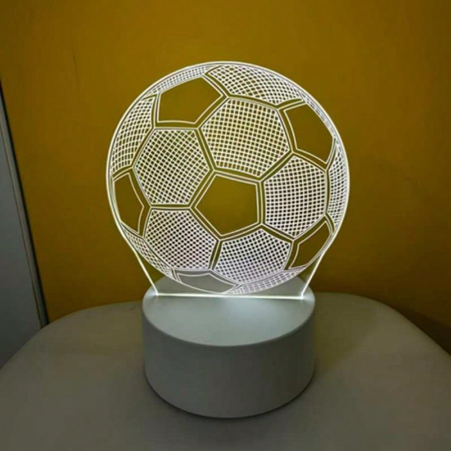 Ilumina la pasion por el deporte con esta lampara nocturna LED con efecto de ilusion 3D en forma de balon de futbol. Diseñada para sorprender, cuenta con una placa acrilica grabada con laser que, al encenderse, crea una visualizacion tridimensional impactante. Su base blanca incorpora un boton tactil inteligente que te permite alternar facilmente entre 7 colores vibrantes o elegir un modo de cambio automatico para ambientar la habitacion segun tu estado de animo. Se alimenta de manera practica mediante conexion USB directa, ideal para conectar a la computadora o un adaptador de pared. Es el elemento decorativo perfecto para mesas de noche en dormitorios infantiles, escritorios o salas de juegos, siendo un regalo original y moderno para cualquier fanatico del soccer.