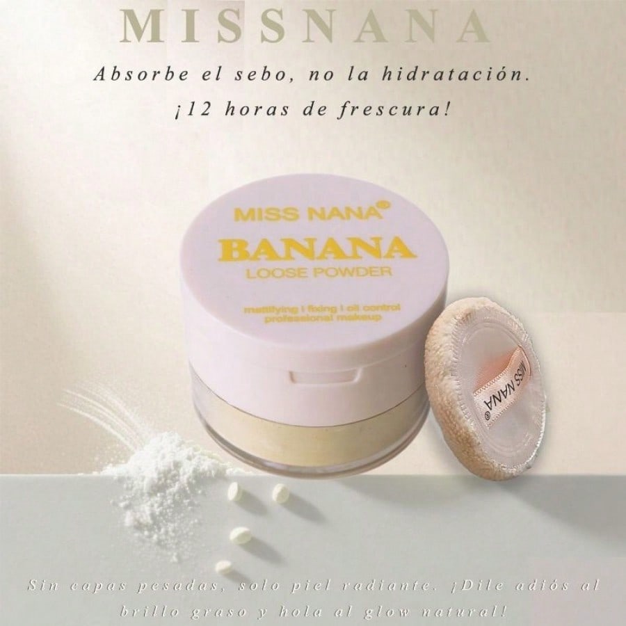 "1. Rosa Plátano para Control de Grasa y Maquillaje de Larga Duración, Adaptado Precisamente al Clima Cálido Adaptado al clima cálido y húmedo de México, absorbe la grasa al instante tras su aplicación, manteniendo el maquillaje sin brillo hasta por 6 horas. El tono blanco plátano corrige la oxidación y la opacidad de la base, manteniendo un acabado limpio y mate incluso después de sudar en mercados o fiestas, evitando la vergüenza de un rostro graso. 2. Ligero y Cómodo, una bendición de verano para pieles con tendencia al acné El polvo está finamente molido, sin dejar una sensación pesada ni de mascarilla en la piel. No obstruye los poros incluso en climas cálidos, lo que lo hace adecuado para pieles grasas, sensibles y con tendencia al acné, satisfaciendo a la perfección la preferencia local por un look de maquillaje ""ligero y natural"". 3. Empaque Rosa y Amarillo Fresco, Éxito Garantizado en Redes Sociales El frasco rosa claro con la inscripción ""BANANA"" en amarillo brillante captura a la perfección la tendencia de ""belleza dulce"" en TikTok/Instagram México. Publicar fotos con el hashtag #MexicanMakeupSettingProducts garantizará fotos de alta calidad y atraerá fácilmente a jóvenes entusiastas de la belleza. 4. Incluye una borla de polvo aterciopelada y un mini frasco para retoques fáciles. El frasco compacto cabe fácilmente en una caja roja importada, y la borla aterciopelada incluida elimina la necesidad de herramientas adicionales: es perfecta para retoques rápidos en cualquier momento y lugar, ya sea en una cita o de compras, controlando al instante el brillo e iluminando tu cutis. 5. Subtono blanco plátano para un acabado impecable. El suave tono blanco plátano es universalmente favorecedor, apto para todo tipo de piel. Ya sea que tengas un tono de piel claro o un bronceado intenso, corrige naturalmente la opacidad e ilumina la tez sin lucir cenicienta ni pálida. 6. Fórmula segura y conforme a las normas para piel sensible. Cumple con las normas de seguridad de la NOM mexicana para el cuidado de la piel, libre de aditivos que causan acné y sensibilizan. No causa enrojecimiento ni escozor incluso en pieles sensibles durante los cambios estacionales, equilibrando el control de la grasa y la suavidad."